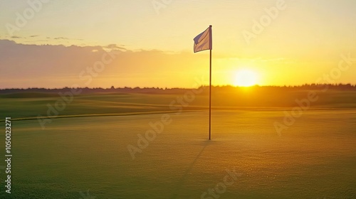 Golf shot landing close to the hole, flag waving gently, golden hour lighting