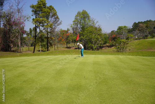 Golfer putting ball on the green golf, lens flare on sun set evening time.