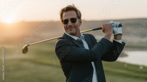 Golfing elegance: A stylish individual, sporting sunglasses, poised in a perfect golf swing, embodies sophistication and the thrill of the game.