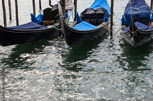 Gondolas in Venice in the morning, reflections of sunlight on water surface, seen from San Marco square, Italy