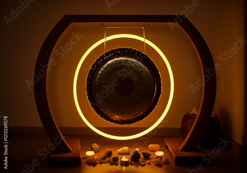 Gong with warm backlighting and candles and crystals, creating a peaceful and meditative atmosphere