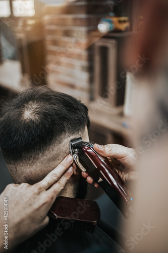 Good looking young adult man getting a hair and beard styling and dressing treatment by professional hairstylist.