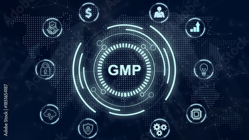Good manufacturing practice certification quality control on virtual screen. GMP 3d illustration