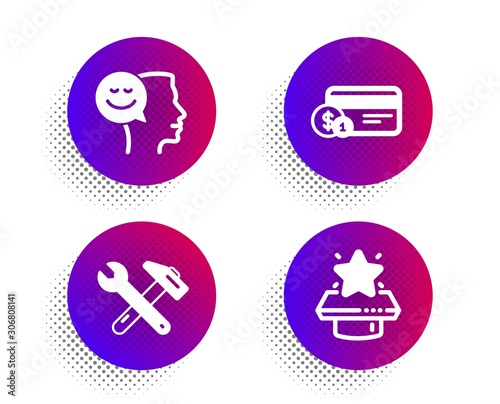 Good mood, Spanner tool and Payment method icons simple set. Halftone dots button. Winner podium sign. Positive thinking, Repair, Cash or non-cash payment. First place. Technology set. Vector