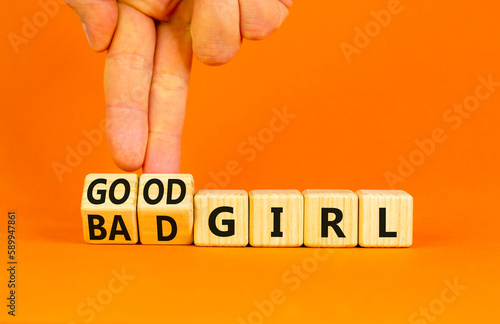 Good or bad girl symbol. Concept word Good girl Bad girl on wooden cubes. Businessman hand. Beautiful orange table orange background. Business psychological good or bad girl concept. Copy space.