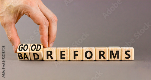Good or bad reforms symbol. Concept words Good reforms Bad reforms on beautiful wooden blocks. Beautiful grey table grey background. Businessman hand. Business good bad reforms concept. Copy space