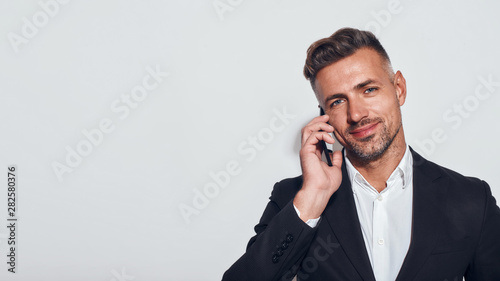 Good talk. Handsome bearded businessman talking on the phone and smiling while standing against grey background