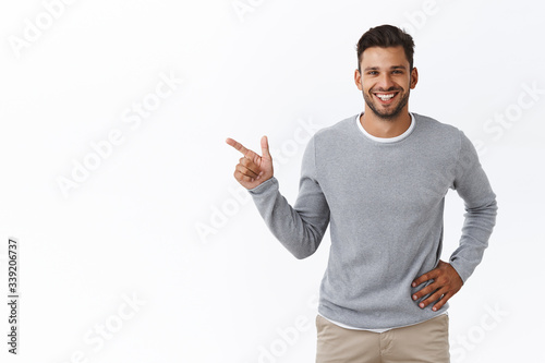 Good-looking smiling, happy bearded 25s man in grey sweater, talking about product features, suggest place to grab cup coffee sit and talk to friend he met street, standing joyful, recommend promo