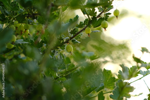 Gooseberries growing on a branch in a garden during late afternoon light by a warm summer day