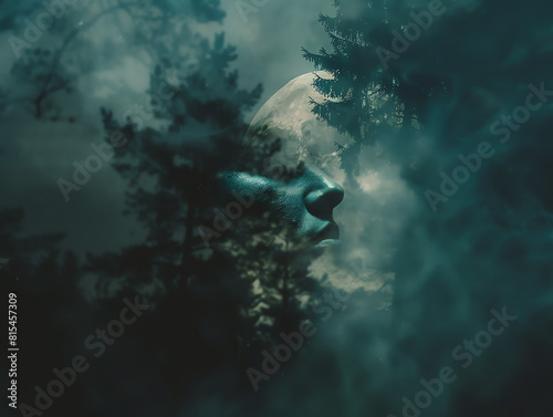 Goosebumps captured in eerie moonlit forest selective focus, spooky theme, ethereal, Double exposure, forest at night as backdrop.