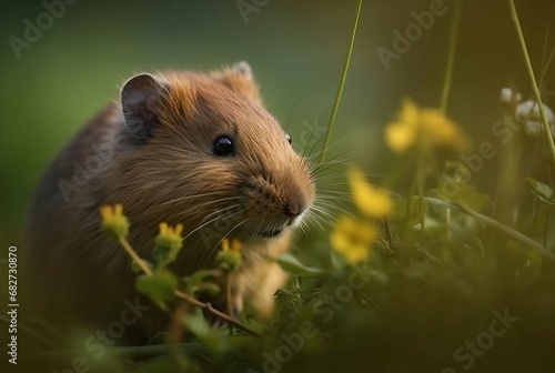 Gopher in field with wild flowers closeup photo. Wildlife rodent animal in natural environment. Generate ai