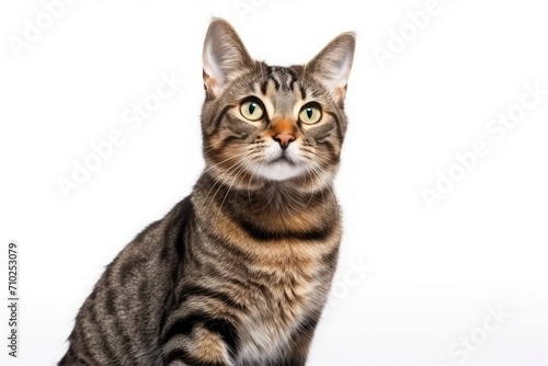 Gorgeous adult tabby cat posing against white background in a studio portrait