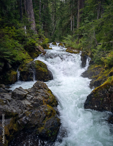 Gorgeous Deer Creek cascading and bursting thru the boulders and branches with a natural mountain setting in the Mount Rainier National Park in Washington State