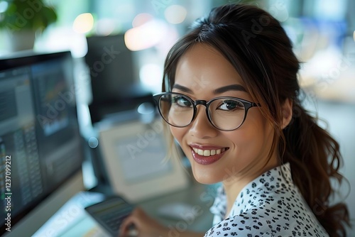 Gorgeous Female Executive in Eyeglasses Cheerfully Analyzing Financial Data in Office, Brainstorming and Crunching Numbers on Computer and Calculator.