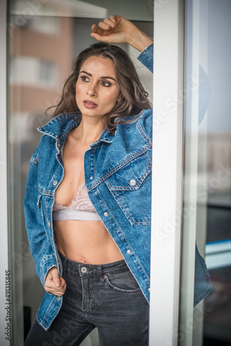 Gorgeous glamour brunette woman with blue jacket posing on modern balcony with amazing view on city .Portrait of a Stylish fashionable woman with long hair , black jeans wearing in balcony