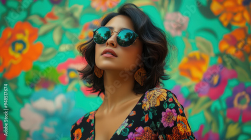 Gorgeous Mexican woman in trendy city clothes with a backdrop of a colorful floral