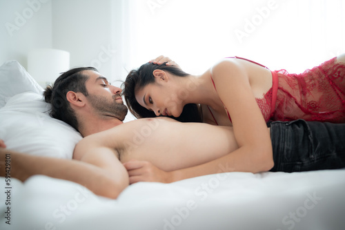 Gorgeous sexy couple enjoying arousing sex before having sex on bed in home bedroom The concept of emotional and love relationships.