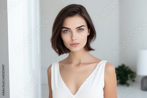 Gorgeous Slender Brunette With An Appealing And Elegant Demeanor On The Background Of White Wall