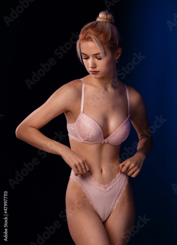 Gorgeous woman posing in seductive pink lingerie. Attractive seduce beauty lady. Advertising underwear sensual slim fit body on dark blue background free space for text
