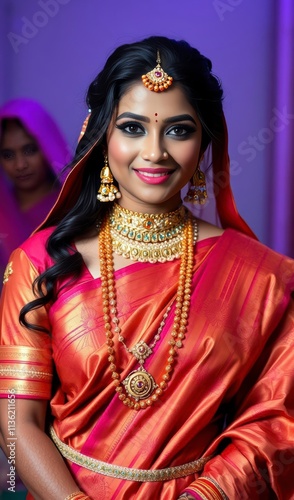 Gorgeous Young Indian Woman in Traditional Hindu Bridal Attire Wearing a Beautiful Saree and Sparkling Jewelry for a Wedding Ceremony