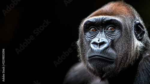Gorilla portrait, dark background, zoo habitat, wildlife conservation