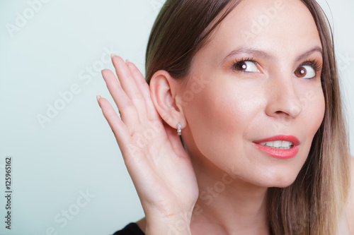 Gossip girl eavesdropping with hand to ear.