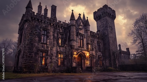 Gothic castle at dusk, mysterious and atmospheric.