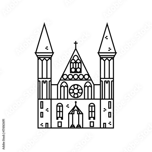 Gothic church flat line icon on isolated background. Vector outline illustration of chapel with stained glass windows.