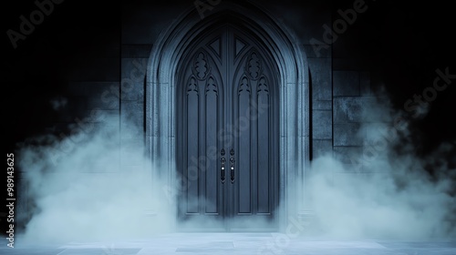 Gothic crypt door, heavy iron, obscured by mist