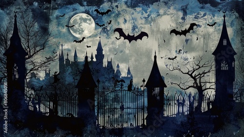Gothic Halloween image with a dark castle under a full moon, silhouettes of flying bats, and vampires greeting guests at the gate