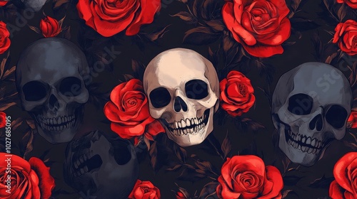 Gothic seamless pattern with skulls and red roses, perfect for Halloween designs