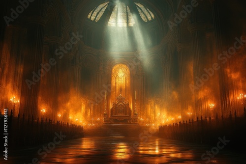 gothic throne room illuminated with golden candlelight featuring ornate antique chair and dramatic shadows