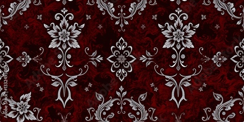 Gothic Velvet Textile Pattern with Silver Embroidery in Deep Red and Black