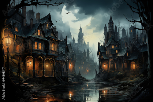 Gothic village at night, hauntingly beautiful, reflecting on water against a dark, eerie backdrop