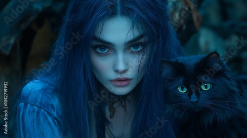 Gothic Witch with a mysterious black cat. Goth. Gothic. Feline. Halloween scene.
