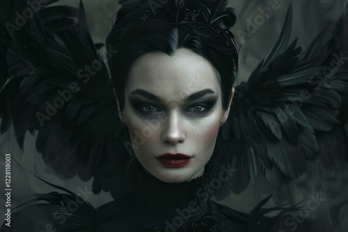 Gothic woman with dark makeup and black feather costume posing for a dramatic portrait