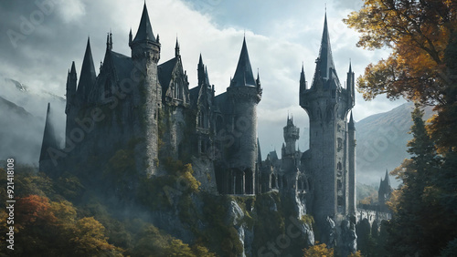 Gothic-style castle with an airy view, mysterious nature, 16:9 widescreen, 300 dpi, with space for text