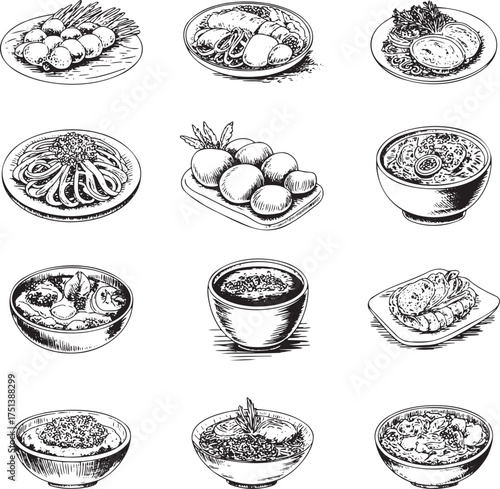 Gourmet Asian Cuisine: Hand-Drawn Engraving Collection of Traditional Dishes, Noodles, and Curries