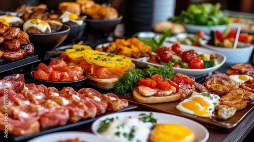 Gourmet breakfast, vibrant colors, delicious dishes, close-up, detailed