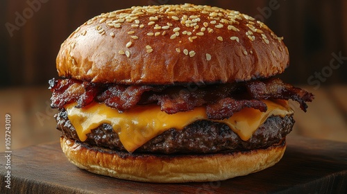 Gourmet Burger Delight, a tantalizing close-up of a juicy burger topped with melted cheese and crispy bacon, presented on a rustic wooden board