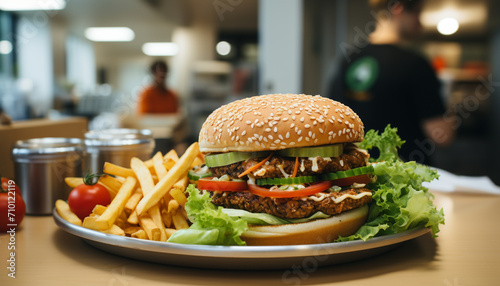 Gourmet burger on table, fresh and delicious generated by AI