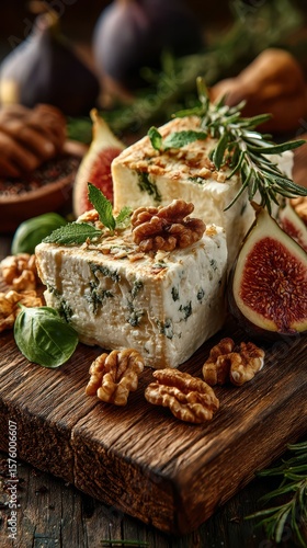 Gourmet cheese platter featuring fresh figs, walnuts, and herbs in a rustic setting