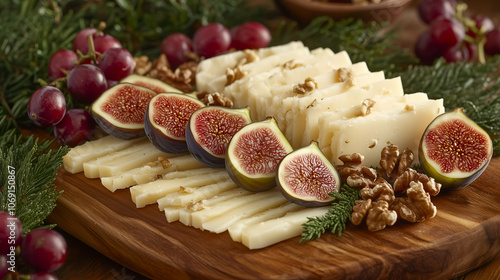 Gourmet Cheese Platter with Figs, Grapes, and Walnuts on Wooden Board