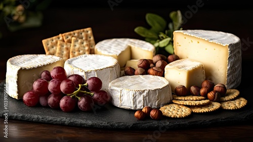 Gourmet cheese platter with grapes, nuts, and crackers on a slate board.