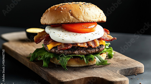 Gourmet cheeseburger with bacon, fried egg, tomato, lettuce, and cheese on a sesame seed bun, served on a wooden board.