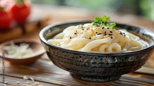 Gourmet dish of pasta topped with grated Parmesan cheese and herbs,