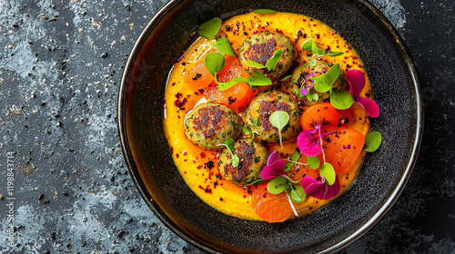 Gourmet falafel balls in vibrant orange sauce, garnished with edible flowers and herbs.