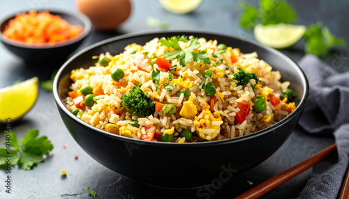 Gourmet Fried Rice: A tantalizing shot of a vibrant bowl of gourmet fried rice, a delightful fusion of flavors and textures. Rich and colorful.