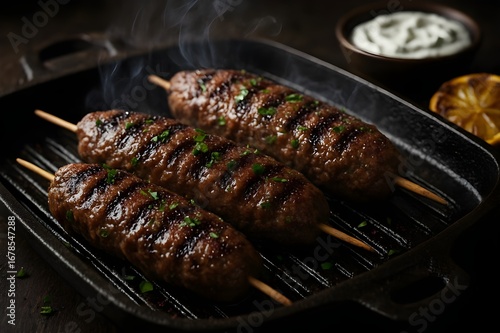 Gourmet Grilled Lamb Kofta Kebabs on a Sizzling Pan