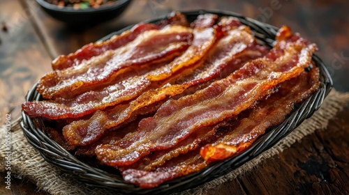 Gourmet keto snacks concept. A close-up of crispy, glazed bacon strips arranged in a basket, keto snack ideas